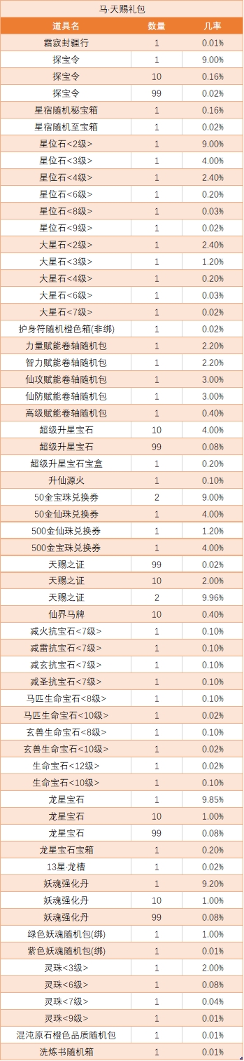 《仙侠世界》对本次活动礼包概率数值公布如下,请各位上仙们查阅!